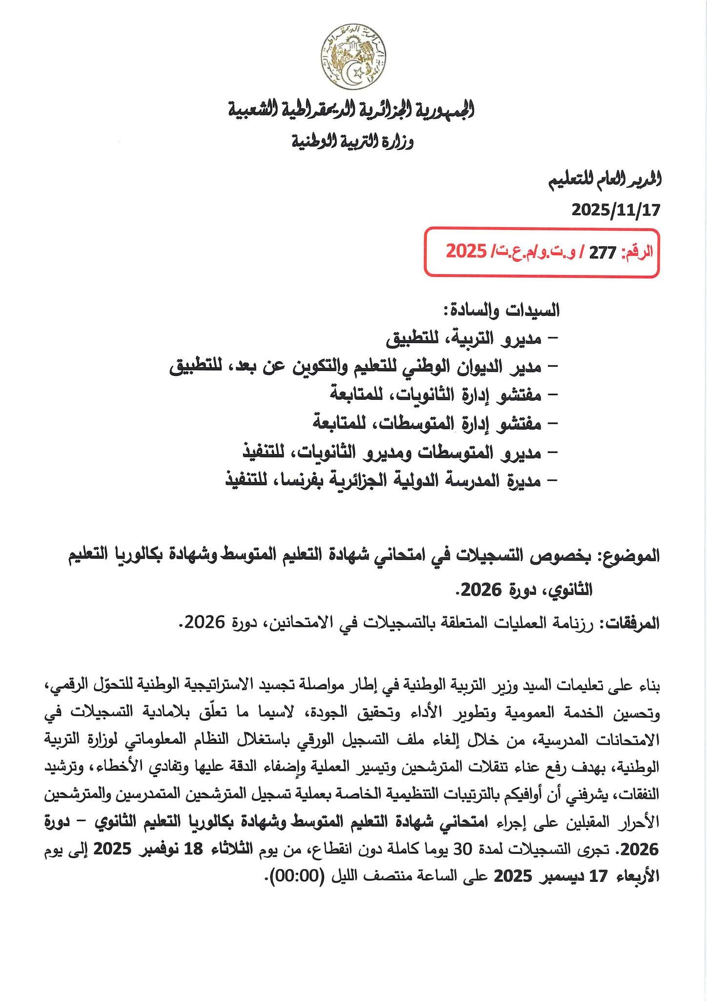بناء على تعليمات السيد وزير التربية الوطنية في إطار مواصلة تجسيد الاستراتيجية الوطنية للتحول الرقمي، وتحسين الخدمة العمومية وتطوير الأداء وتحقيق الجودة، لاسيما ما تعلق بتلاميذ التسجيلات في الامتحانات المدرسية، من خلال ملف التسجيل الورقي باستغلال النظام المعلوماتي لوزارة التربية الوطنية، بهدف رفع عناء تنقلات المترشحين وتيسير العملية وإضفاء الدقة عليها وتفادي الأخطاء، وترشيد النفقات، يشرفني أن أوافيكم بالترتيبات التنظيمية الخاصة بعملية تسجيل المترشحين المتمدرسين والمترشحين الأحرار المقبلين على إجراء امتحاني شهادة التعليم المتوسط وشهادة بكالوريا التعليم الثانوي – دورة 2026. تجرى التسجيلات لمدة 30 يوما كاملة دون انقطاع، من يوم الثلاثاء 18 نوفمبر 2025 إلى يوم الأربعاء 17 ديسمبر 2025 على الساعة منتصف الليل (00:00).